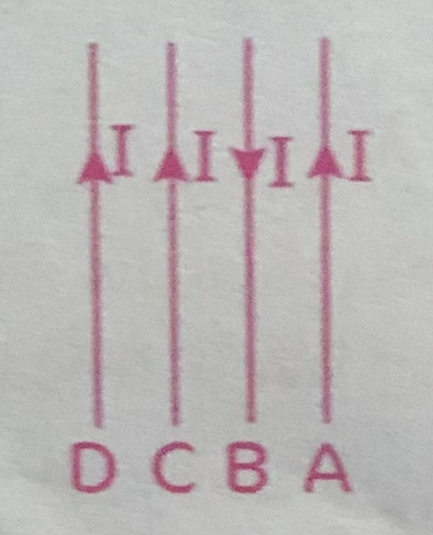22- في الشكل 4 أسلاك متوازية يمر بها نفس شدة التيار والمسافات بينهم متساوية فإن السلك (C) يتأثر بقوة من تأثير باقي الاسلاك تكون………..؟