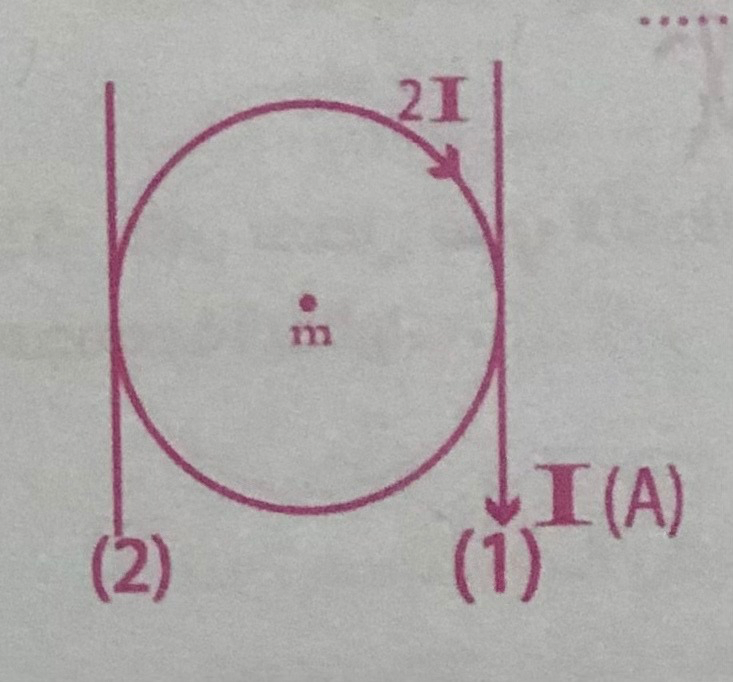 13- حلقة معدنية يمر بها تيار كهربي شدته 2I ، فيولد فيض مغناطيسي عند مركز الحلقة (m) كثافته (B) ، ثم وُضع سلكان مستقيمان (1)،(2) مماسان للحلقة وفي نفس مستواها ويمر بكل منهما تيار كهربي. لكي تظل محصلة شدة المجال المغناطيسي عند النقطة (m) هي (B) فإن التيار المار في السلك (2) تكون شدته ………. واتجاهه………….؟
