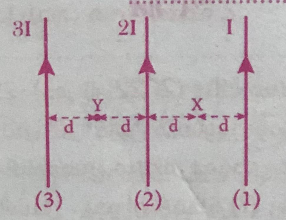 7- في الشكل المقابل ثلاثة أسلاك مستقيمة طويلة متوازية موضوعة في نفس المستوى ويمر بكل منها تيار كهربي فإذا انعدم تيار السلك (1) فإن مقدار محصلة كثافة الفيض المغناطيسي عند النقطتين Y , X على الترتيب ؟
