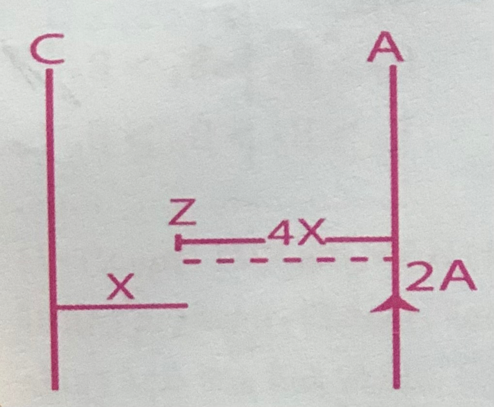 10- يُمثل الشكل الموضح سلكين متوازيين طويلين (A)،(C) يمر في كل منهما تيار كهربي للحصول على نقطة تعادل عند النقطة (Z) فأي من الخيارات التالية هو الصحيح لقيمة واتجاه التيار المار في السلك (C) ؟