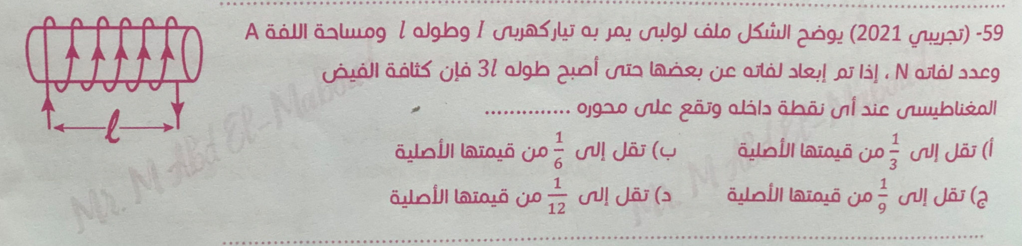 18- ملف لولبي من سلك نحاس معزول يمر به تيار كهربي (I) A وكثافة الفيض المغناطيسي عند محوره (B) ، عند إبعاد لفاته عن بعضها بانتظام فإن كثافة الفيض المغناطيسي عند منتصف طوله على محوره تصبح B ¼ ، فإذا تم اعادة كثافة الفيض المغناطيسي إلى قيمتها الأولى (B) وذلك بزيادة شدة التيار الكهربي المار بالملف بمقدار 3A فتكون شدة التيار I تساوي…….؟