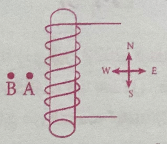 17- ملف يمر به تيار موضوع أفقيًا في مجال الأرض المغناطيسي وكانت كثافة الفيض الكلي التي عند نقطة B,A هي 1mT ، صفر وعندما عكس اتجاه التيار في الملف فإن كثافة الفيض عند B,A تصبح……….. ، ……….. على الترتيب ، علمًا بأن مجال الارض المغناطيسي 3mT